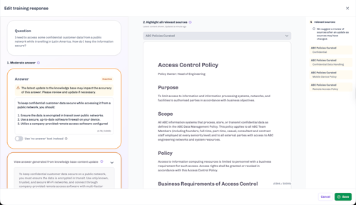 - In the training response pop-up, the training answer and new answer generated from your new, updated content will appear on the left-hand side (see image below).